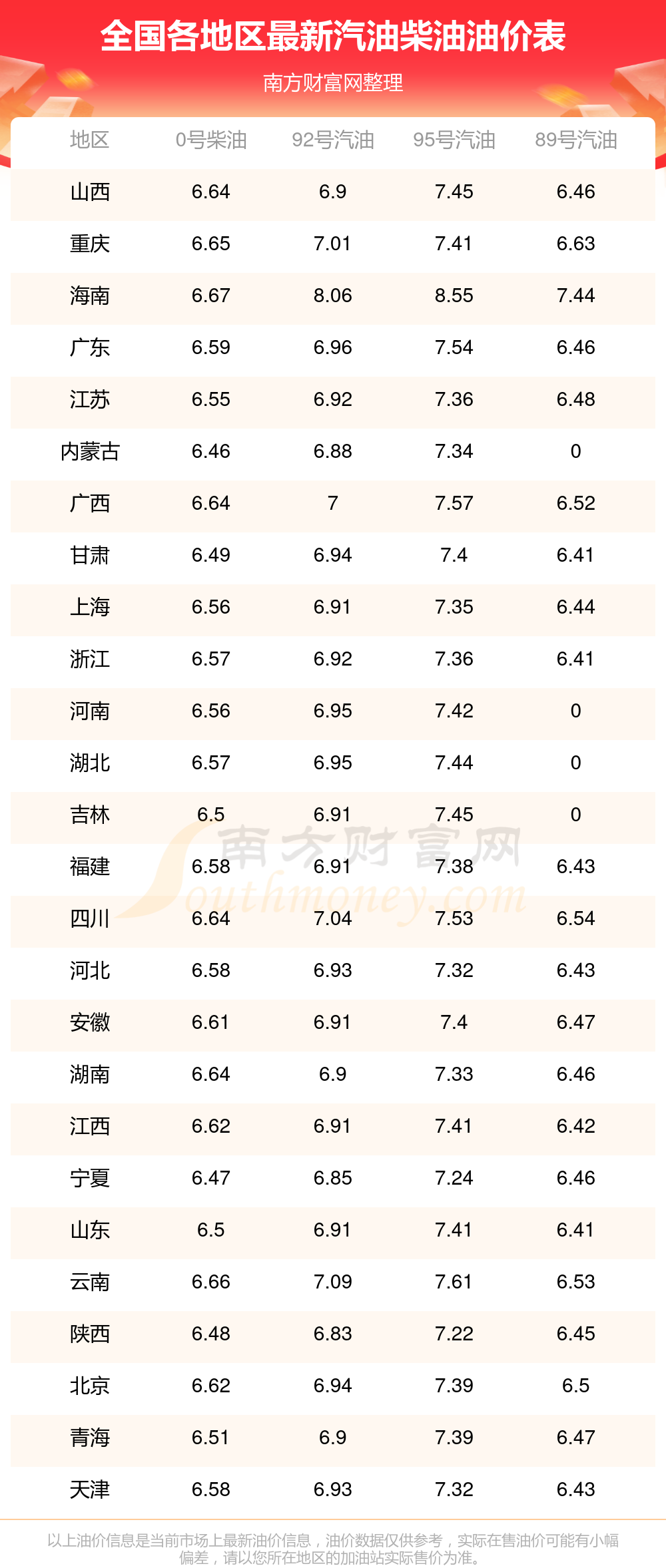 2025年全國各地區(qū)最新油價表