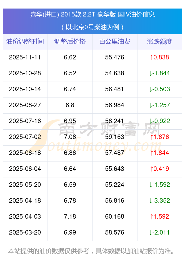 按照11月11日0號柴油最新調整價格6.62元/升來計算(以北京為例),該車型百公里平均油費為55.476元,按照上一輪10月28日調整價格6.52元/升來計算,百公里平均油費為54.638元,對比上一輪多花0.838元,下一輪油價調整時間為11月24日24時。
