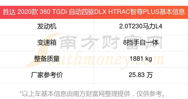 在動(dòng)力上,勝達(dá) 2020款 380 TGDi 自動(dòng)四驅(qū)DLX HTRAC智尊PLUS配備的是一臺(tái)2.0T230馬力L4渦輪增壓發(fā)動(dòng)機(jī),匹配的是8擋手自一體自動(dòng)檔變速箱,燃料形式為汽油,常規(guī)整備質(zhì)量1881kg,廠(chǎng)家參考價(jià)25.83萬(wàn)元。