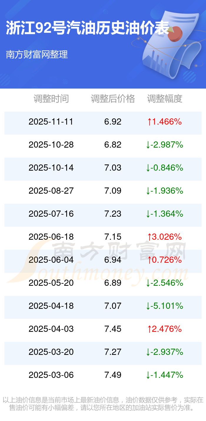11月13日,浙江92號汽油的價格是6.92元每升,本次的調整時間為11月11日,對比上次的調整上漲了0.1元,上漲1.466%,11月24日24時為下一輪油價調整時間,還有11.67天。