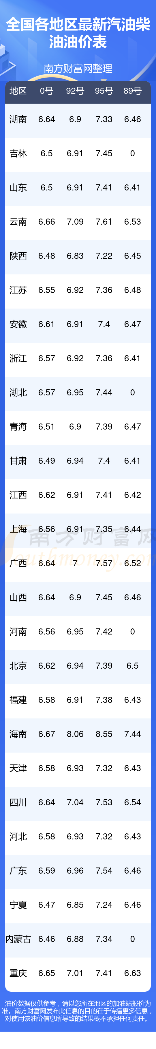 以上數(shù)據(jù)僅供參考,請以您所在地區(qū)的加油站實際售價為準。南方財富網(wǎng)發(fā)布此信息的目的在于傳播更多信息,對使用該油價信息所導致的結(jié)果概不承擔責任。