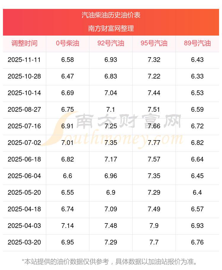 2025年95號汽油價格一覽表