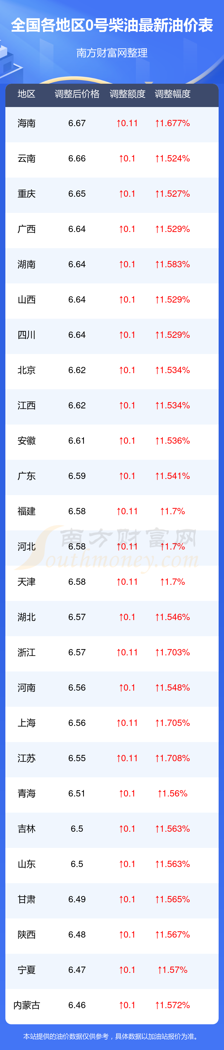 11月13日,安徽0號柴油的價格是6.61元每升,本次的調(diào)整時間為11月11日,對比上次的調(diào)整增了0.1元,增1.536%,下次調(diào)整時間為11月24日24時,還有11.64天。