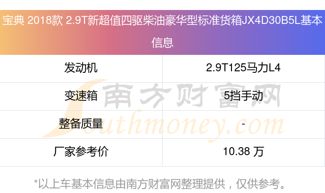 寶典 2018款 2.9T新超值四驅(qū)柴油豪華型標(biāo)準(zhǔn)貨箱JX4D30B5L搭載了一臺2.9T125馬力L4渦輪增壓發(fā)動機(jī),采用5擋手動擋變速箱,廠家參考價10.38萬元。