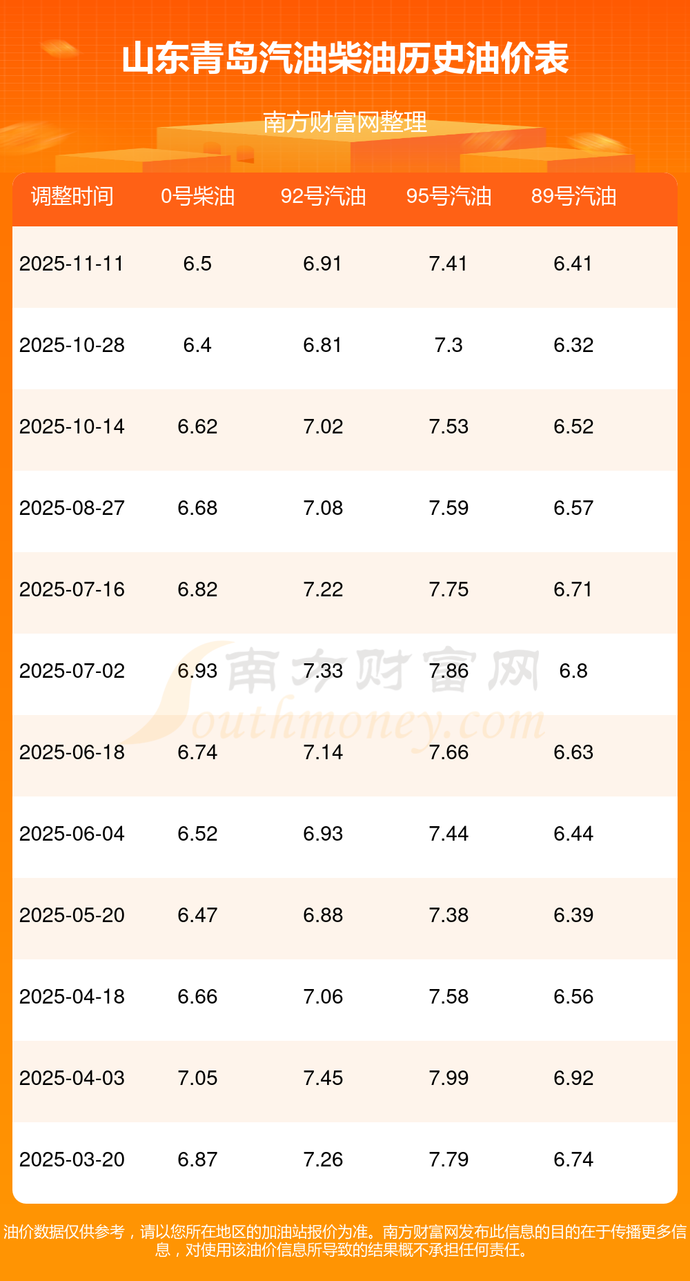 山東青島汽油、柴油11月13日每升最新價(jià)格為:0號(hào)柴油為6.5元,升了0.1元;95號(hào)汽油為7.41元;92號(hào)汽油為6.91元;89號(hào)汽油為6.41元,調(diào)整時(shí)間為11月11日。