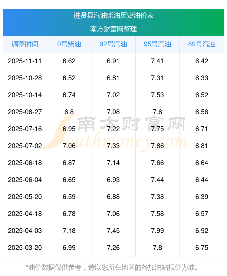 進(jìn)賢縣歷史油價(jià)表