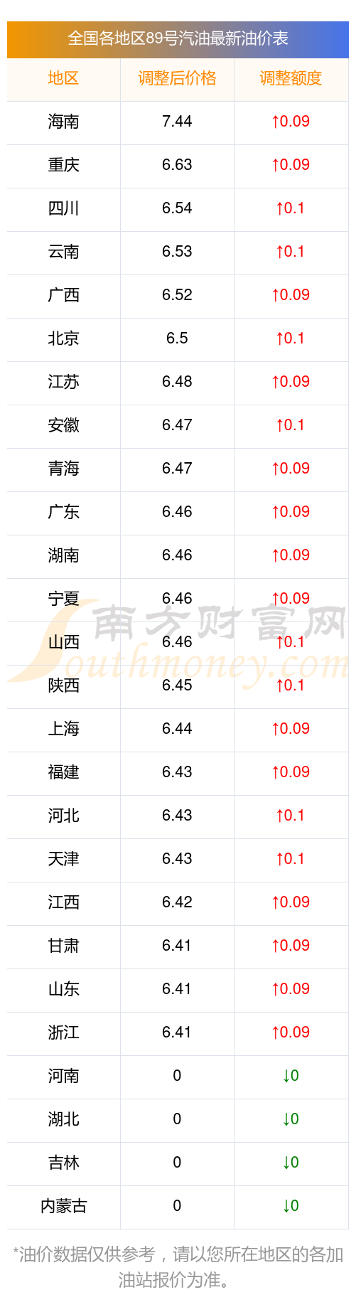 全國(guó)各地區(qū)89號(hào)汽油油價(jià)一覽表