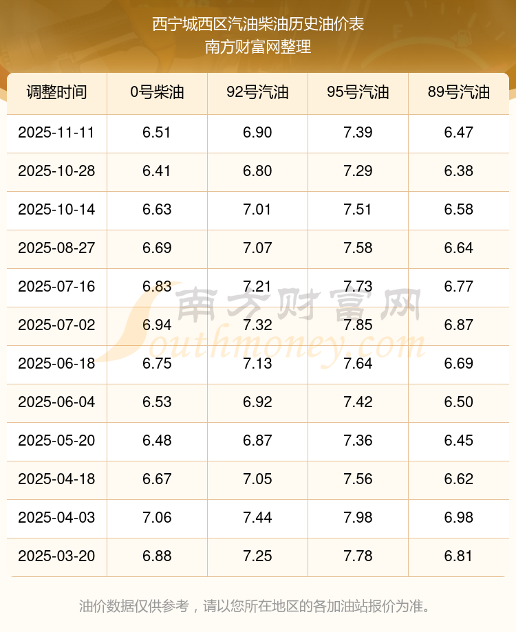 油價調(diào)整最新消息:下一輪油價調(diào)整時間11月24日24時。西寧城西區(qū)汽油、柴油11月13日每升的價格是多少?11月11日調(diào)整后的價格詳情如下:92號汽油6.9元;95號汽油7.39元;89號汽油6.47元;0號柴油6.51元。