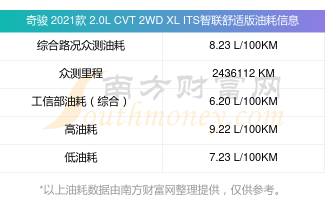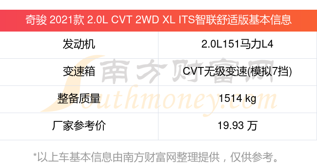 奇駿 2021款 2.0L CVT 2WD XL ITS智聯(lián)舒適版動(dòng)力上搭載的是一臺(tái)2.0L151馬力L4自然吸氣發(fā)動(dòng)機(jī),匹配CVT無級(jí)變速(模擬7擋)自動(dòng)檔變速箱,燃料形式為汽油,常規(guī)整備質(zhì)量1514kg,廠家參考價(jià)19.93萬元。
