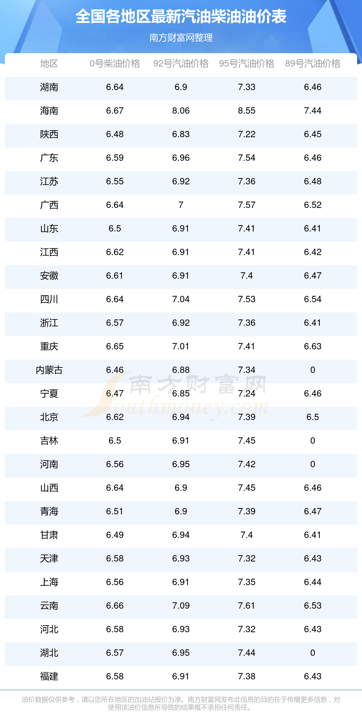 油價數(shù)據(jù)僅供參考,請以您所在地區(qū)的加油站報(bào)價為準(zhǔn)。南方財(cái)富網(wǎng)發(fā)布此信息的目的在于傳播更多信息,對使用該油價信息所導(dǎo)致的結(jié)果概不承擔(dān)任何責(zé)任。