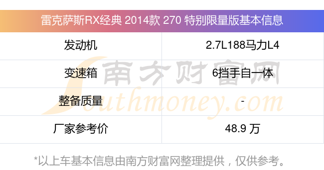 雷克薩斯RX經(jīng)典 2014款 270 特別限量版動(dòng)力上配備的是一臺2.7L188馬力L4自然吸氣發(fā)動(dòng)機(jī),匹配的是6擋手自一體自動(dòng)檔變速箱,燃料形式為汽油,廠家參考價(jià)48.9萬元。