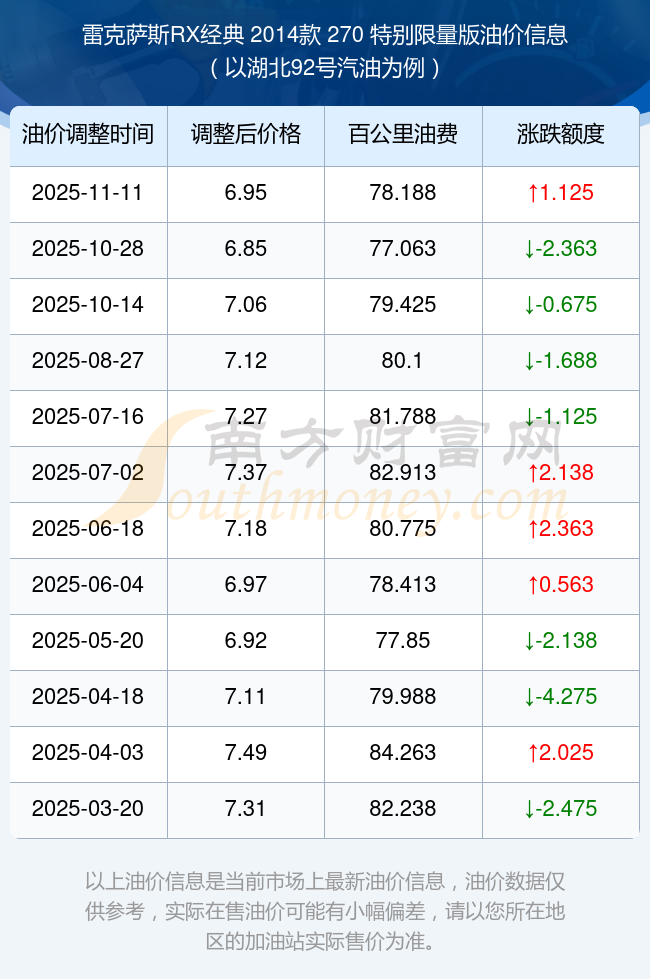 按照11月11日92號汽油最新調(diào)整價(jià)格6.95元/升來計(jì)算(以湖北為例),該車型百公里平均油費(fèi)為78.188元,按照上一輪10月28日調(diào)整價(jià)格6.85元/升來計(jì)算,百公里平均油費(fèi)為77.063元,對比上一輪多花1.125元,下一輪油價(jià)調(diào)整時(shí)間為11月24日24時(shí)。