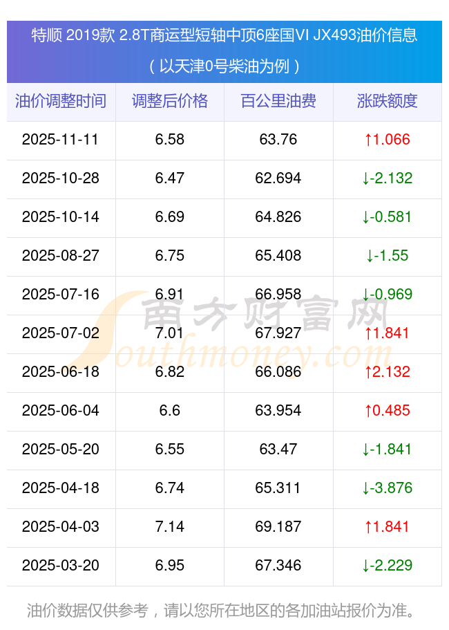 依照11月11日0號柴油最新調(diào)整價格6.58元/升來計(jì)算(以天津?yàn)槔?,該車型百公里的平均油費(fèi)是63.76元,依照上一輪10月28日調(diào)整價格6.47元/升來計(jì)算,百公里的平均油費(fèi)是62.694元,對比上一輪多花1.066元,下一輪的油價調(diào)整時間11月24日24時。