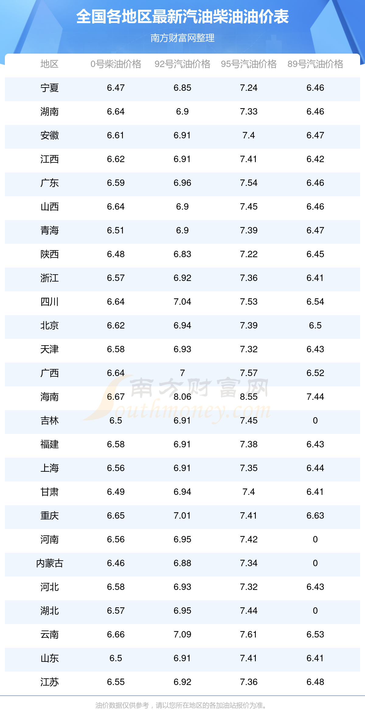 2025年全國各地區(qū)最新油價表