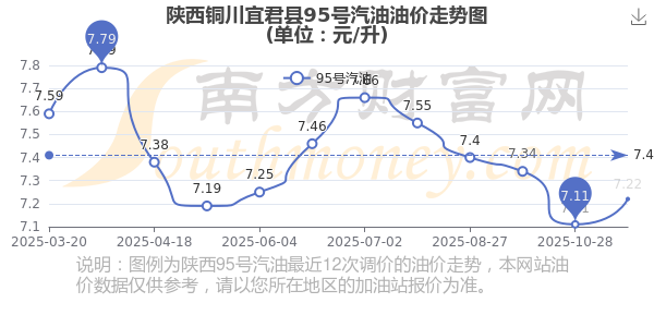 11月13日陜西銅川宜君縣95號(hào)汽油的價(jià)格是7.22元/升(油價(jià)調(diào)整時(shí)間11月11日),相對(duì)上一輪油價(jià)調(diào)整時(shí)間10月28日的價(jià)格7.11元/升,升了0.11元,升幅達(dá)1.547%。