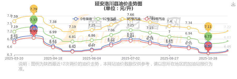 11月13日延安洛川縣汽油、柴油每升的價格詳情如下:92號汽油6.83元,漲了0.1元;95號汽油7.22元,漲了0.11元;89號汽油6.45元,漲了0.1元;0號柴油6.48元,漲了0.1元,本次油價的調整時間為11月11日。