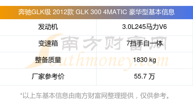 奔馳GLK級 2012款 GLK 300 4MATIC 豪華型搭載了一臺3.0L245馬力V6自然吸氣發(fā)動機,采用7擋手自一體自動檔變速箱,常規(guī)整備質(zhì)量1830kg,廠家參考價55.7萬元。