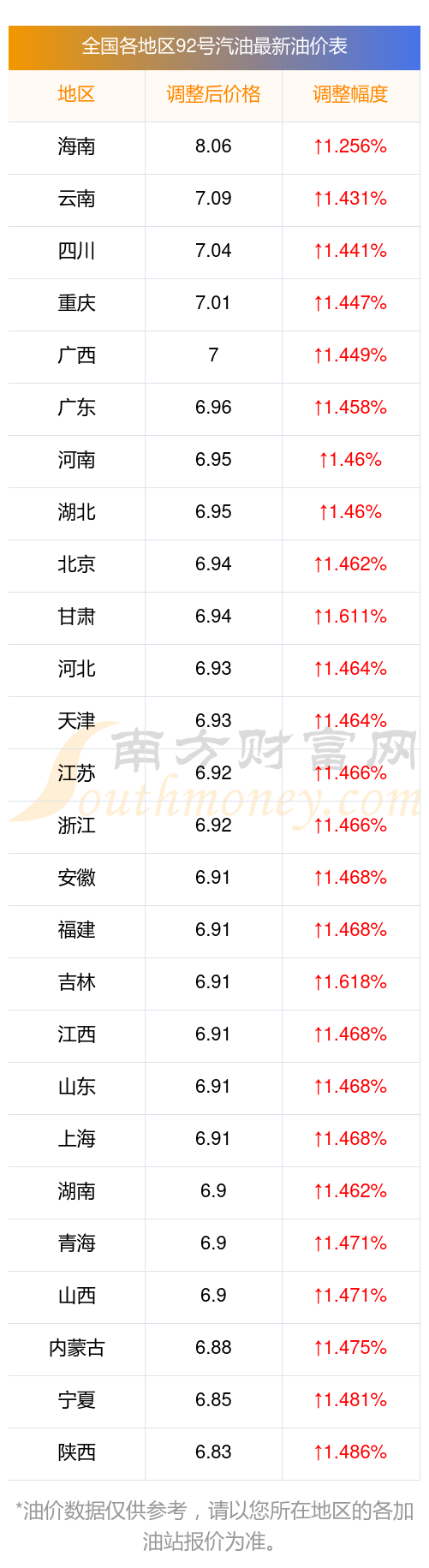 全國(guó)各地區(qū)92號(hào)汽油油價(jià)一覽表