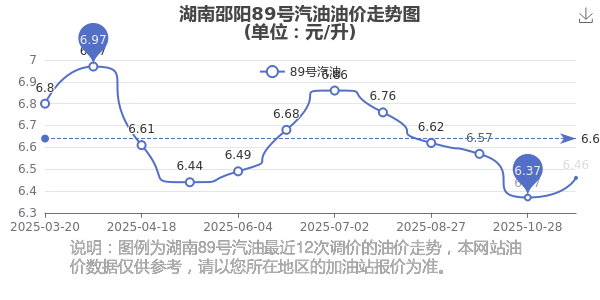 湖南邵陽汽油、柴油11月13日每升的價格為11月11日調(diào)整后的價格,具體油價為:92號汽油6.9元;95號汽油7.33元;89號汽油6.46元;0號柴油6.64元。下一輪油價調(diào)整時間11月24日24時,距離現(xiàn)在還有11.55天。
