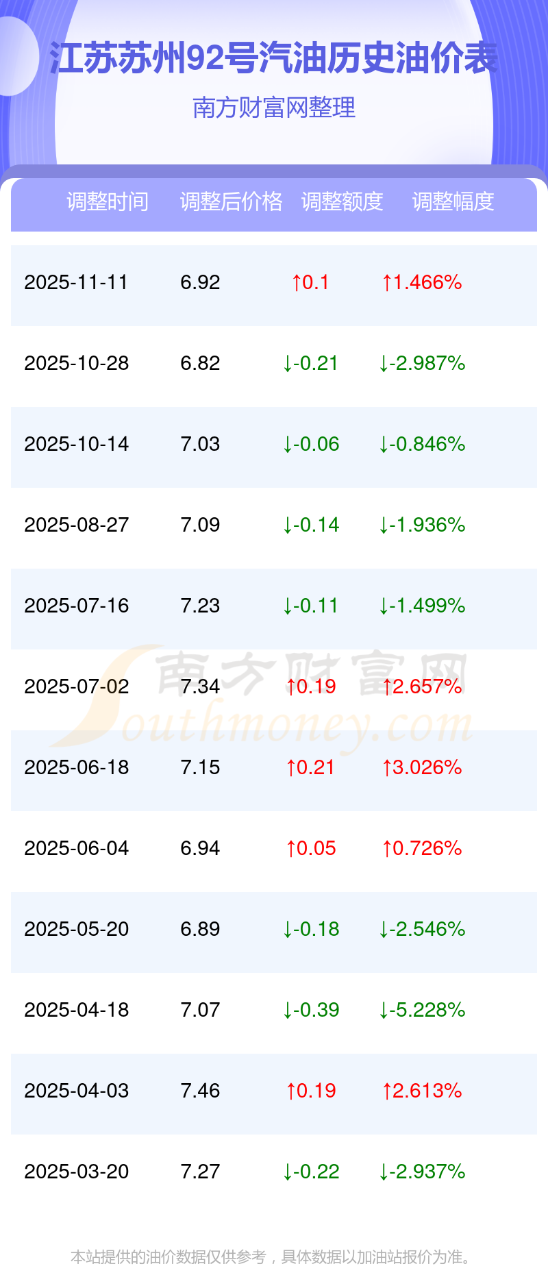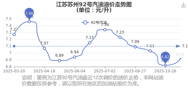 11月13日江蘇蘇州92號汽油的價格為6.92元/升,這是11月11日調(diào)整后的價格,對比上輪調(diào)整上升了0.1元,上升1.466%。