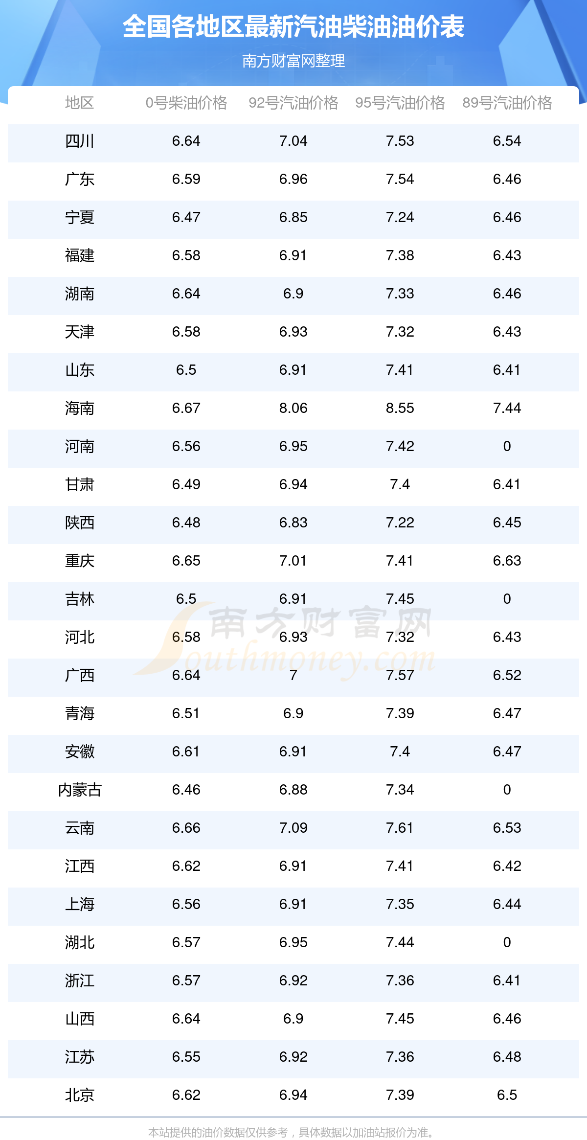 0號柴油平均價格:7元每升,其中,最高為海南,價格6.67元/升,最低為內(nèi)蒙古,價格6.46元/升。