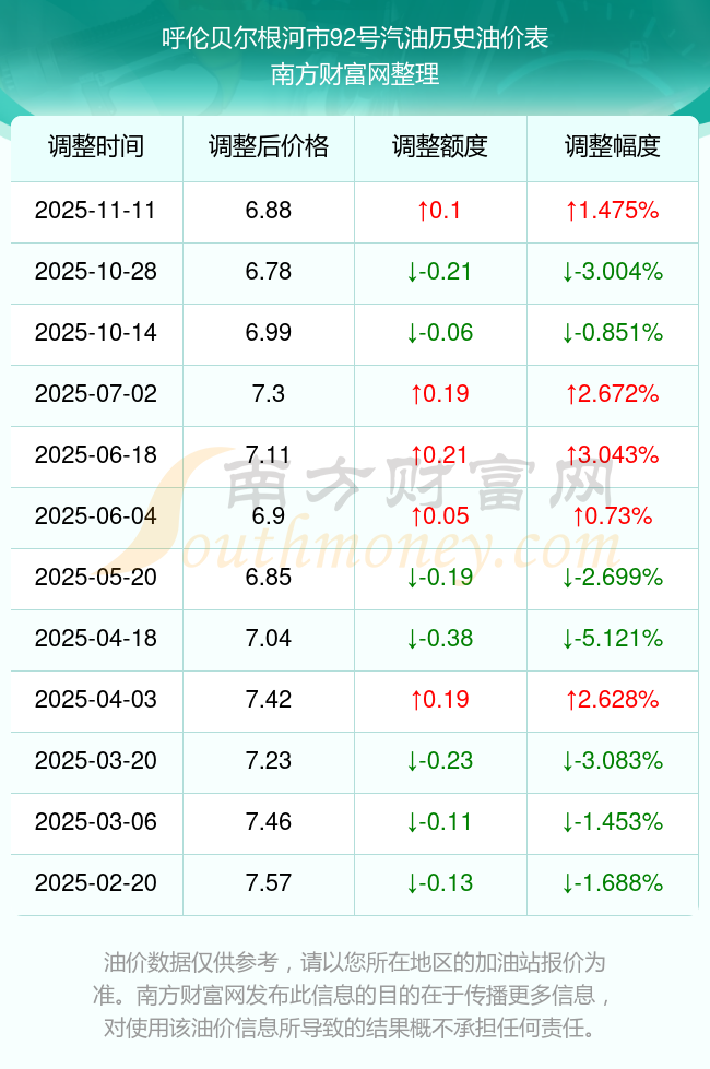 11月13日呼倫貝爾根河市92號汽油歷史油價一覽表