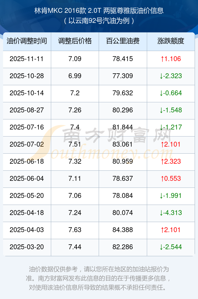 按照11月11日92號汽油最新調(diào)整價格7.09元/升來計算(以云南為例),該車型百公里平均油費為78.415元,按照上一輪10月28日調(diào)整價格6.99元/升來計算,百公里平均油費為77.309元,對比上一輪多花1.106元,下一輪油價調(diào)整時間為11月24日24時。