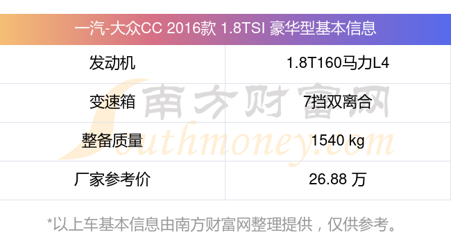 一汽-大眾CC 2016款 1.8TSI 豪華型動力方面,搭載的是一臺1.8T160馬力L4渦輪增壓發(fā)動機,匹配7擋雙離合自動檔變速箱,燃料形式為汽油,常規(guī)整備質(zhì)量1540kg,廠家參考價26.88萬元。