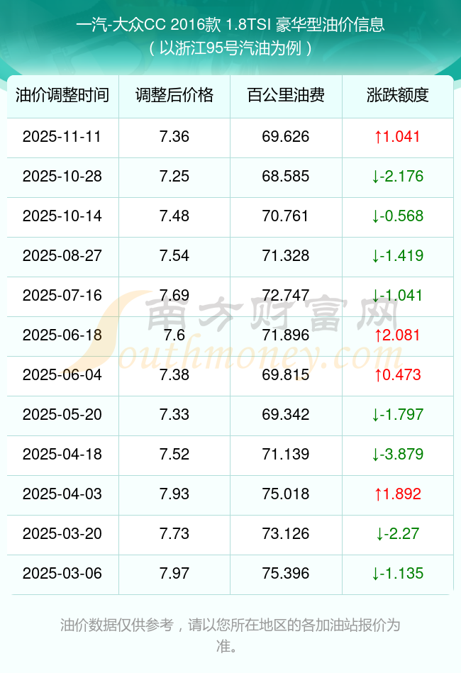 根據(jù)11月11日95號汽油最新調(diào)整價格7.36元/升來計算(以浙江為例),該車型每百公里的平均油費是69.626元,上一輪10月28日調(diào)整價格7.25元每升來計算,每百公里的平均油費是68.585元,對比上一輪多花1.041元,下一輪的油價調(diào)整時間是11月24日24時。