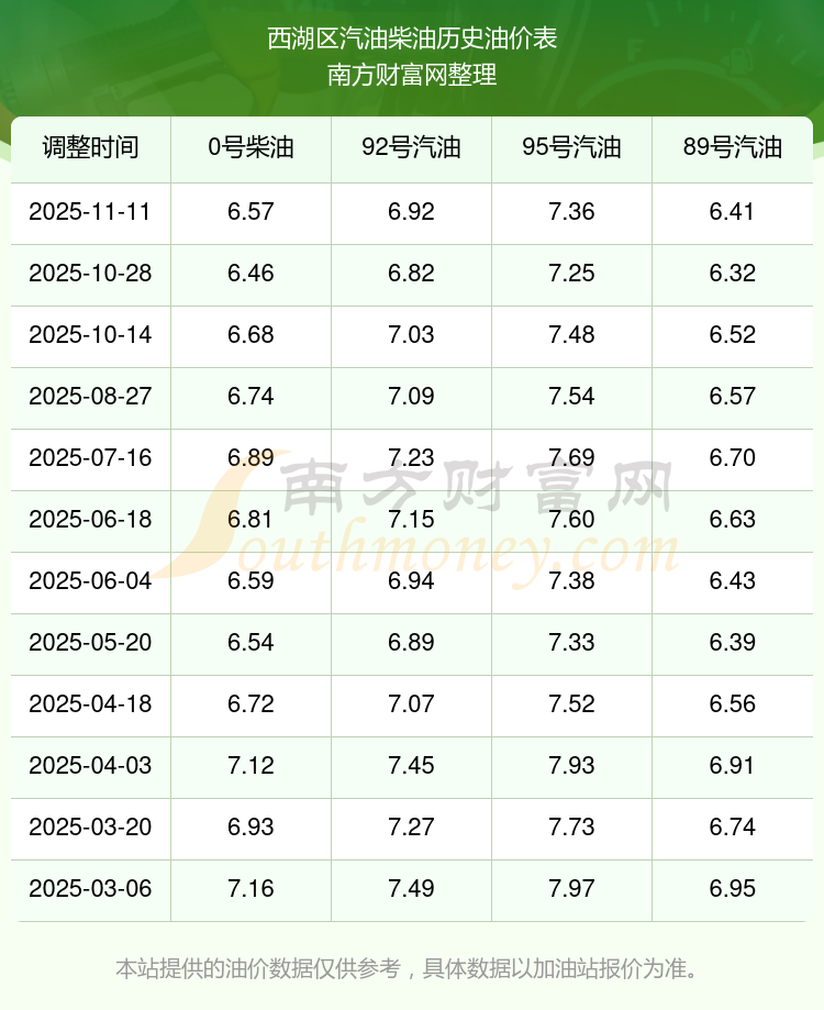 西湖區(qū)汽油、柴油11月13日每升的價(jià)格具體是(11月11日調(diào)整后的價(jià)格):92號(hào)汽油6.92元;95號(hào)汽油7.36元;89號(hào)汽油6.41元;0號(hào)柴油6.57元。