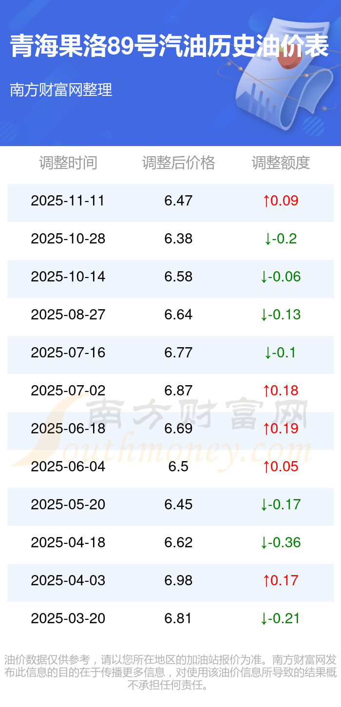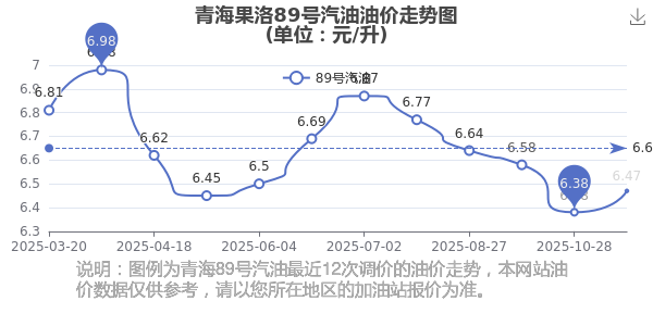 11月13日青海果洛89號汽油的價格是6.47元/升,油價于11月11日調(diào)整,相對上次調(diào)整時間10月28日的油價6.38元每升,共上漲了0.09元,上漲幅達(dá)1.411%。