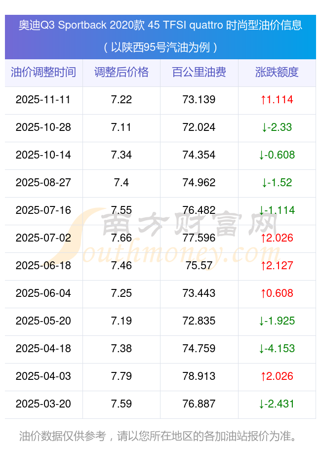 按11月11日95號汽油最新調整價格7.22元每升來計算(以陜西為例),該車型百公里平均油費為73.139元,按上一輪10月28日調整價格7.11元每升來計算,百公里平均油費為72.024元,對比上一輪多花1.114元,下一輪油價調整時間為11月24日24時。