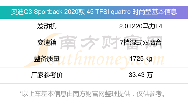 在動力方面,奧迪Q3 Sportback 2020款 45 TFSI quattro 時尚型搭載的是一臺2.0T220馬力L4渦輪增壓發(fā)動機,匹配7擋濕式雙離合自動檔變速箱,燃料形式為汽油,常規(guī)整備質量1725kg,廠家參考價33.43萬元。