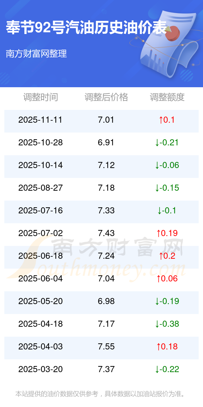 2025年92號(hào)汽油價(jià)格調(diào)整一覽表