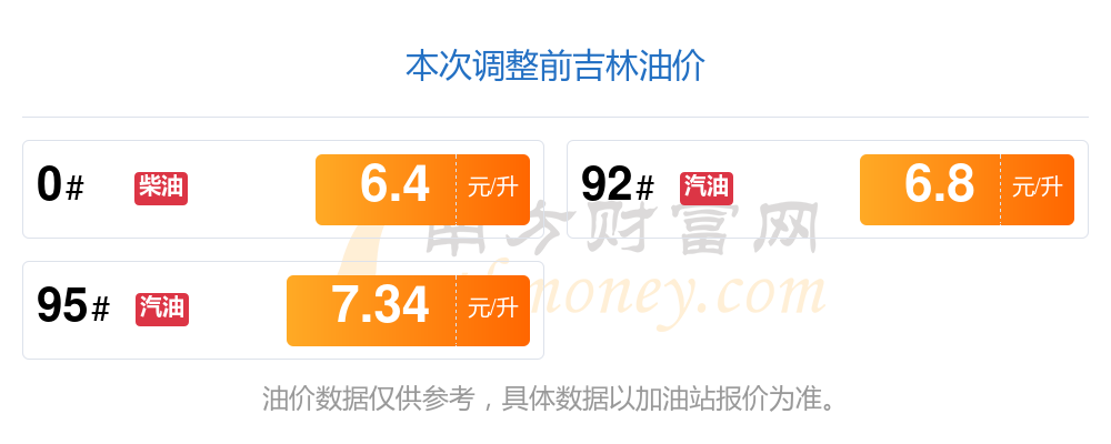 11月13日吉林汽油、柴油每升最新價(jià)格多少錢一升?具體為:92號(hào)汽油6.91元,增了0.11元;95號(hào)汽油7.45元,增了0.11元;0號(hào)柴油為6.5元,增了0.1元,本次的調(diào)整時(shí)間是11月11日。