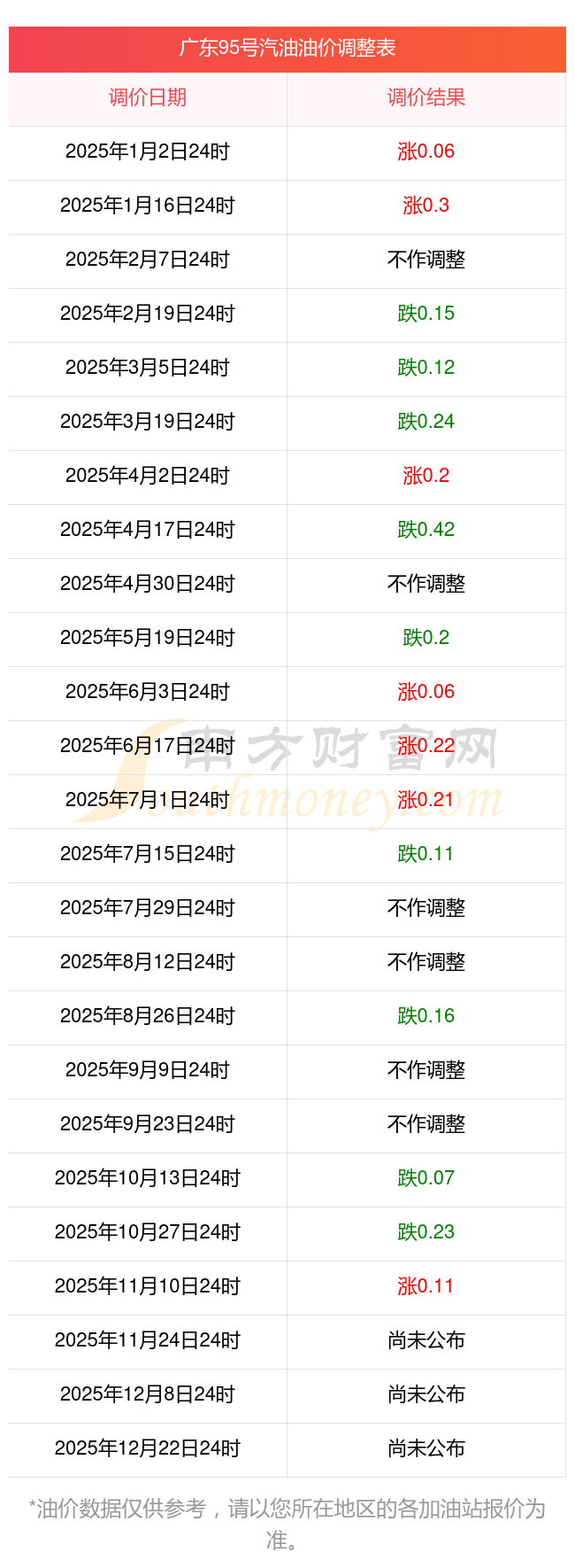 廣東95號汽油油價調整表