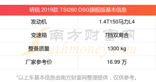 明銳 2019款 TSI280 DSG旗艦版動力方面,搭載的是一臺1.4T150馬力L4渦輪增壓發(fā)動機,匹配7擋雙離合自動檔變速箱,燃料形式為汽油,常規(guī)整備質量1300kg,廠家參考價16.99萬元。