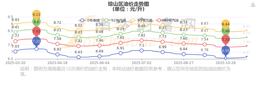 11月13日,瓊山區(qū)汽油、柴油每升最新價格為:92號汽油為8.06元,上升了0.1元;95號汽油為8.55元,上升了0.11元;89號汽油為7.44元,上升了0.09元;0號柴油為6.67元,上升了0.11元,調(diào)整時間為11月11日。