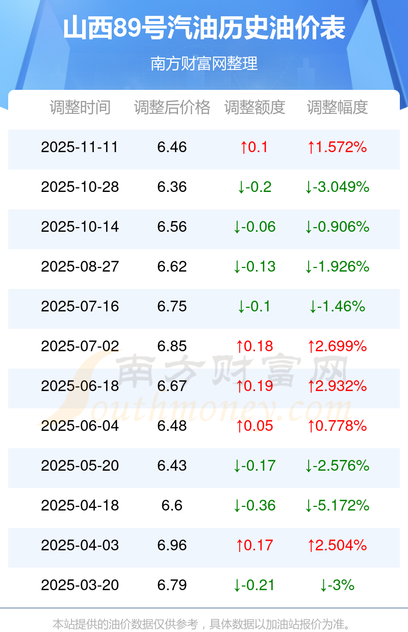11月13日,山西89號(hào)汽油的價(jià)格是6.46元每升,本次的調(diào)整時(shí)間為11月11日,對(duì)比上次的調(diào)整上升了0.1元,上升1.572%,11月24日24時(shí)為下一輪油價(jià)調(diào)整時(shí)間,還有11.49天。