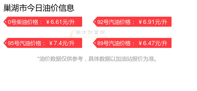 11月13日巢湖市汽油、柴油價(jià)格是11月11日調(diào)整后的價(jià)格,每升價(jià)格具體為:92號(hào)汽油為6.91元,上升了0.1元,上升幅達(dá)1.47%;95號(hào)汽油為7.4元,上升了0.1元,上升幅達(dá)1.37%;89號(hào)汽油為6.47元,上升了0.1元,上升幅達(dá)1.57%;0號(hào)柴油為6.61元,上升了0.1元,上升幅達(dá)1.54%。