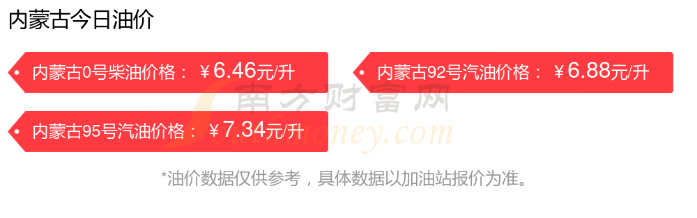 內(nèi)蒙古呼和浩特汽油、柴油11月13日每升的價格具體是(11月11日調(diào)整后的價格):92號汽油6.88元;95號汽油7.34元;0號柴油6.46元。