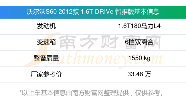 沃爾沃S60 2012款 1.6T DRIVe 智雅版動力上配備的是一臺1.6T180馬力L4渦輪增壓發(fā)動機,匹配的是6擋雙離合自動檔變速箱,燃料形式為汽油,常規(guī)整備質(zhì)量1550kg,廠家參考價33.48萬元。