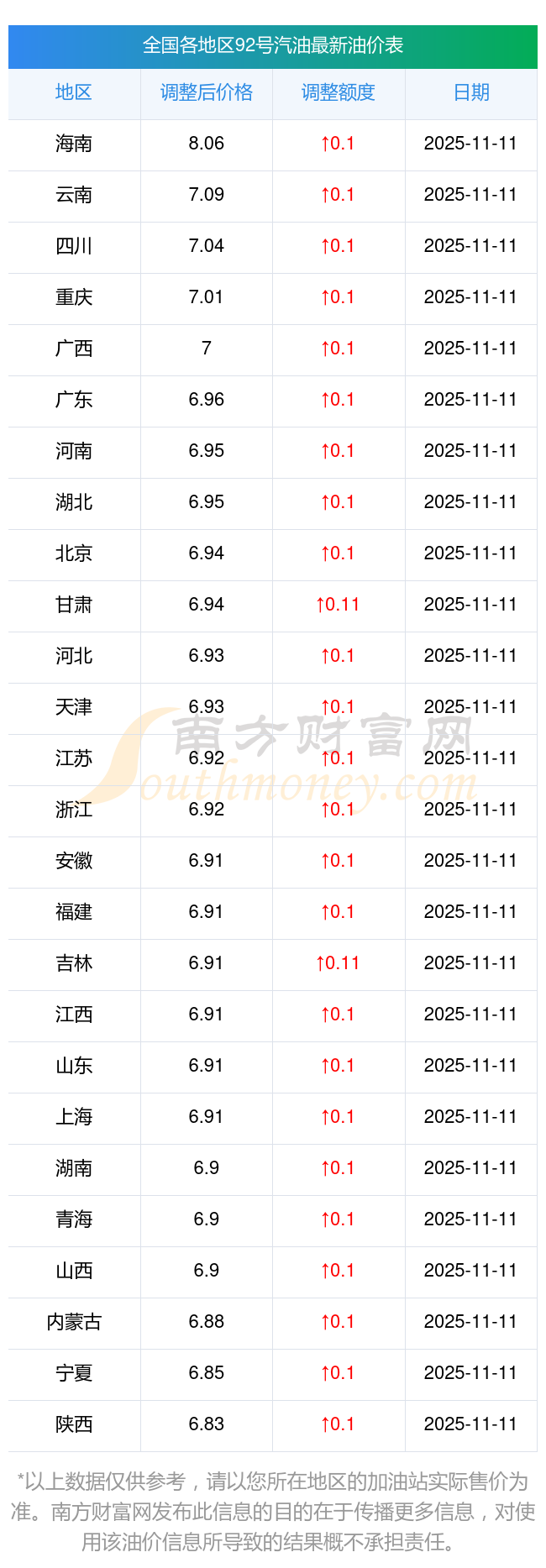 全國(guó)各地區(qū)最新92號(hào)汽油油價(jià)表