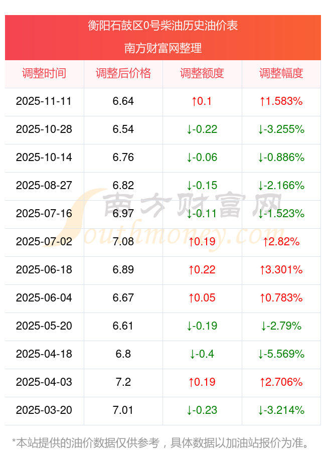 11月13日衡陽石鼓區(qū)0號柴油歷史油價一覽表