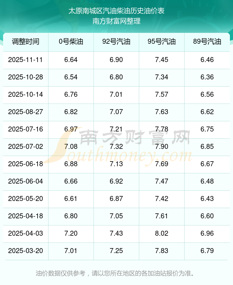 太原南城區(qū)汽油柴油11月13日每升的價格為11月11日調(diào)整后的價格,各油價詳情如下:92號汽油6.9元;95號汽油7.45元;89號汽油6.46元;0號柴油6.64元。