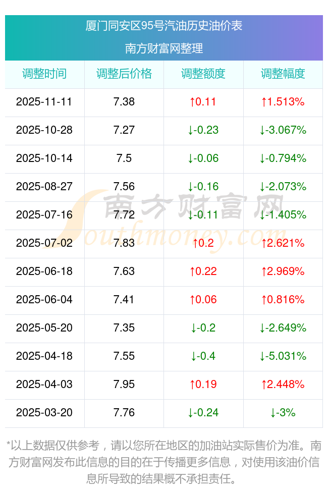 廈門同安區(qū)95號汽油歷史油價(jià)表