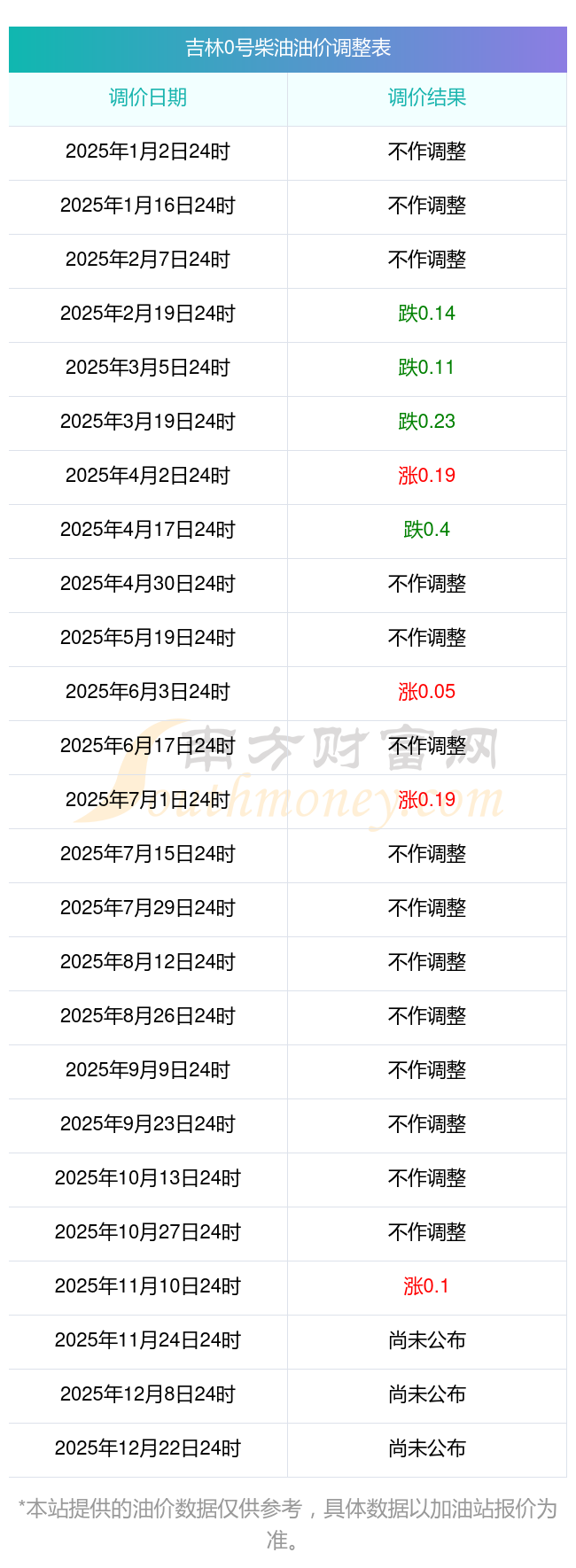 吉林0號(hào)柴油油價(jià)調(diào)整表