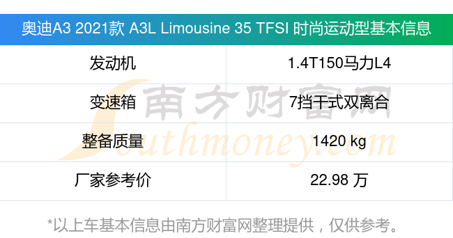 奧迪A3 2021款 A3L Limousine 35 TFSI 時尚運(yùn)動型搭載了一臺1.4T150馬力L4渦輪增壓發(fā)動機(jī),采用7擋干式雙離合自動檔變速箱,常規(guī)整備質(zhì)量1420kg,廠家參考價22.98萬元。