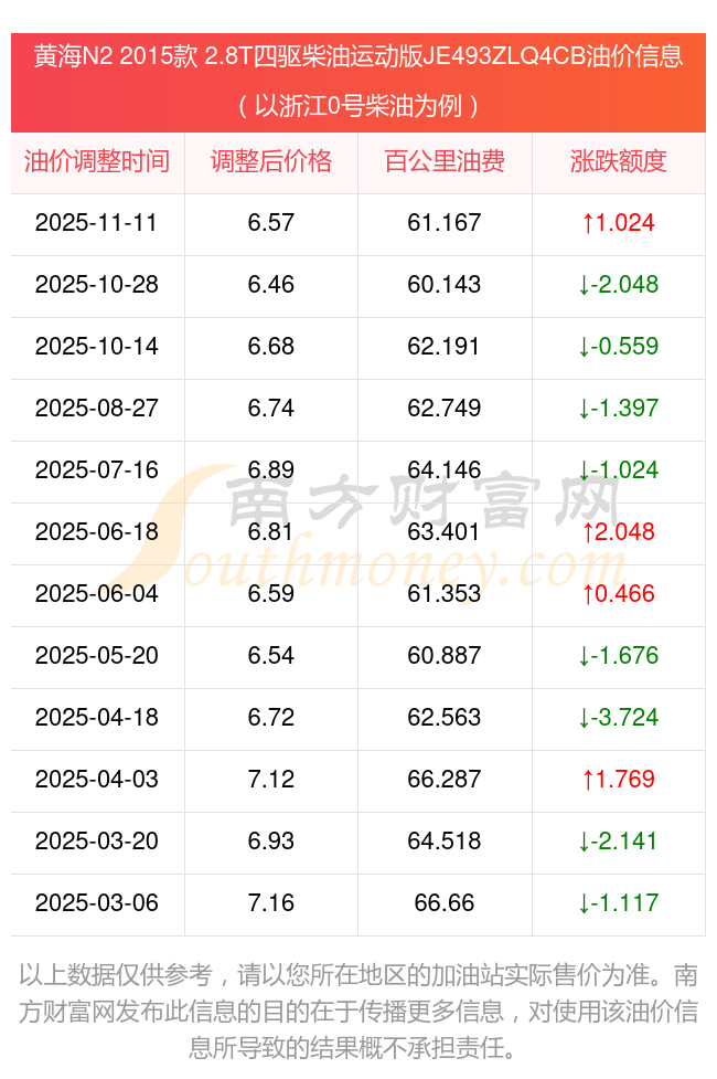 根據(jù)11月11日0號柴油最新調(diào)整價格6.57元/升來計算(以浙江為例),該車型每百公里的平均油費是61.167元,上一輪10月28日調(diào)整價格6.46元每升來計算,每百公里的平均油費是60.143元,對比上一輪多花1.024元,下一輪的油價調(diào)整時間是11月24日24時。