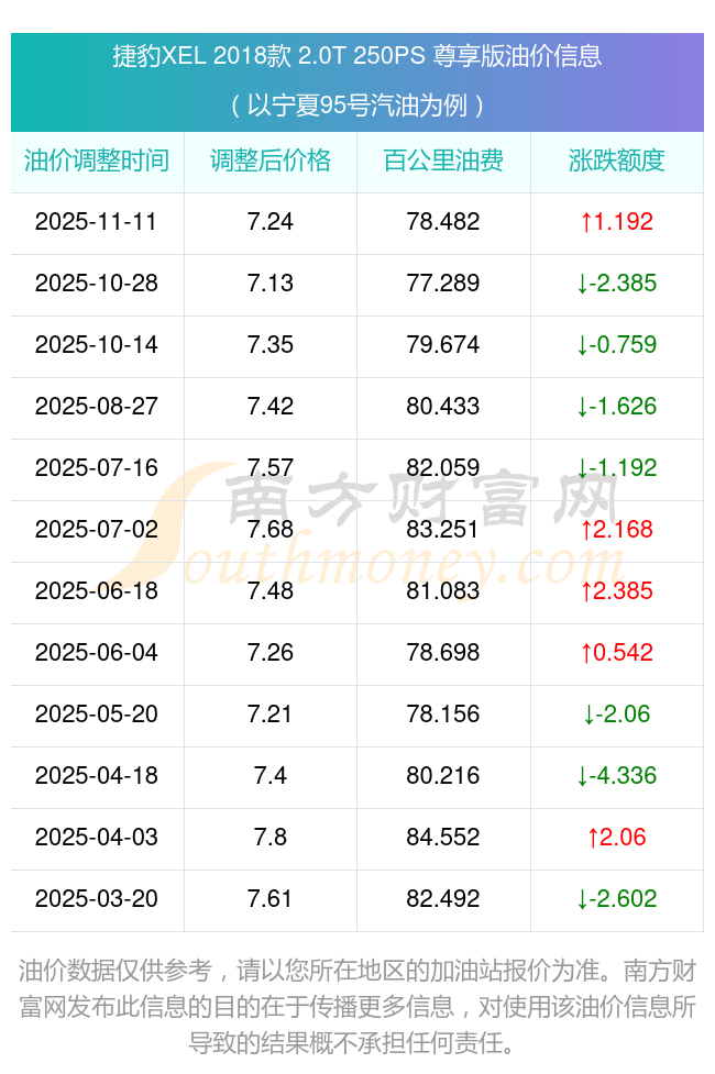 按11月11日95號汽油最新調(diào)整價格7.24元每升來計算(以寧夏為例),該車型百公里平均油費為78.482元,按上一輪10月28日調(diào)整價格7.13元每升來計算,百公里平均油費為77.289元,對比上一輪多花1.192元,下一輪油價調(diào)整時間為11月24日24時。
